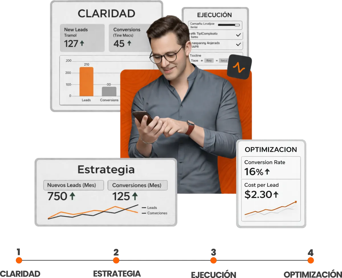 Nos metemos en tu negocio, entendemos cómo vendes hoy y armamos un sistema completo para generar clientes de forma constante. No se trata de probar cosas al azar, sino de diseñar, ejecutar y ajustar con datos claros en cada paso.